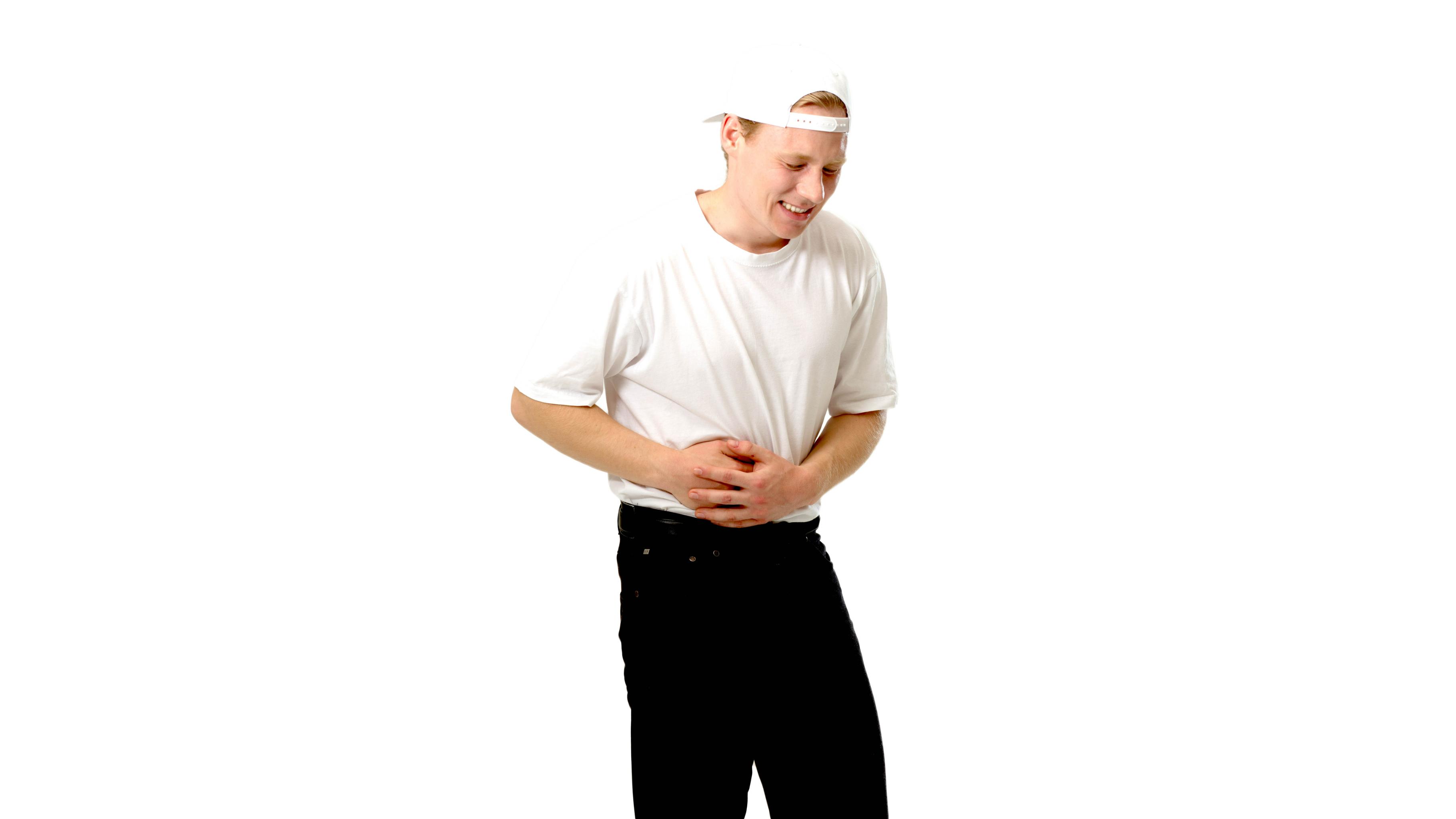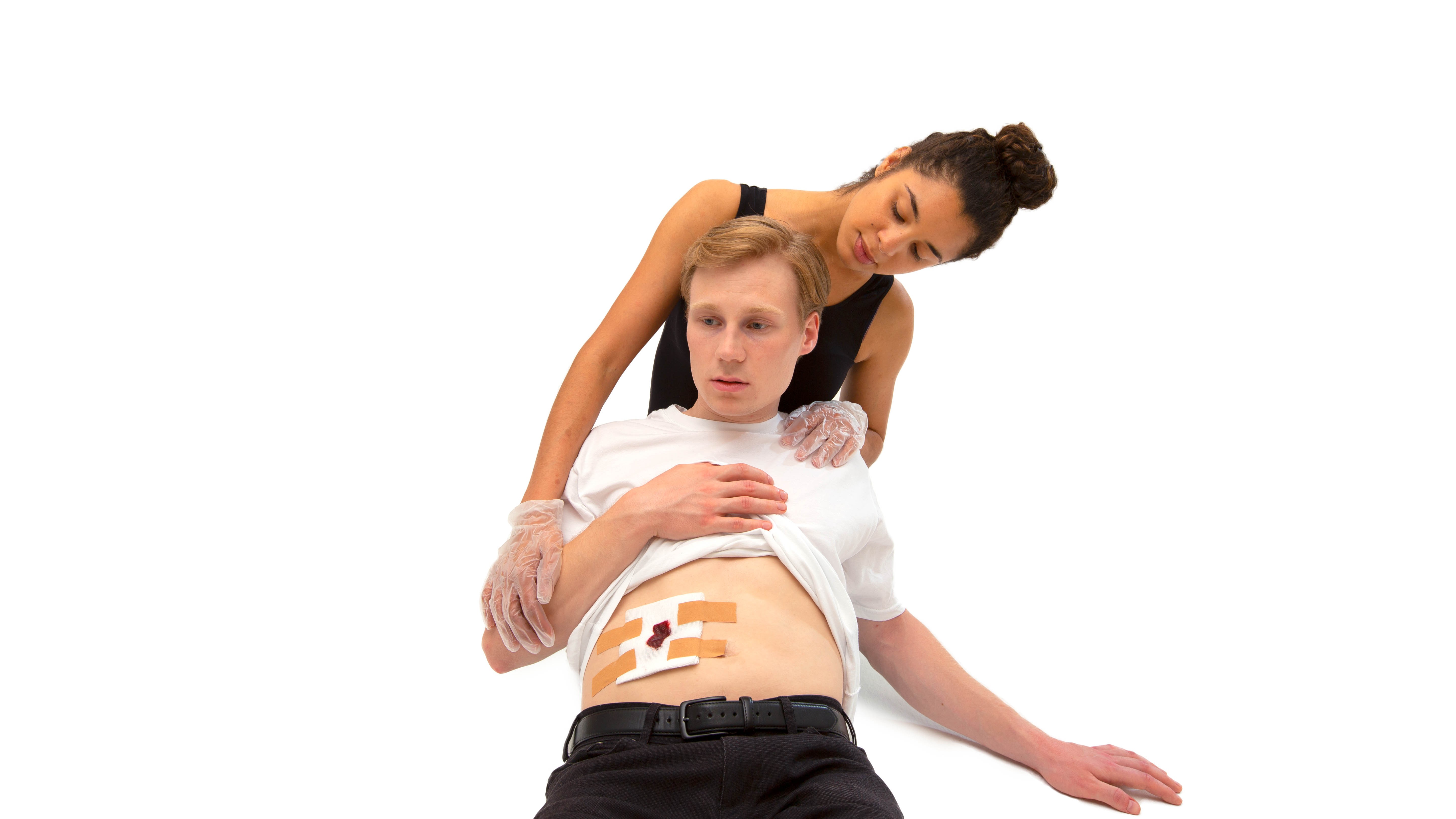Sehen: Die betroffene Person hält sich den Bauch, es kann Blut und/oder eine sichtbare Wunde erkennbar sein.