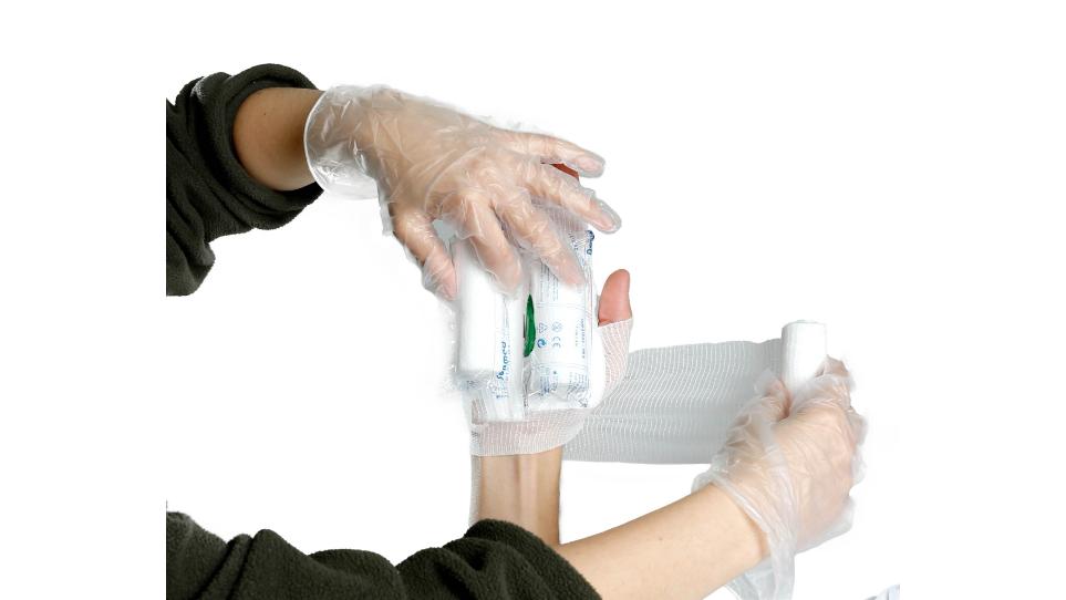 Stabilisieren: Kompressen mit einem Verband 2-3 mal umwickeln. Anschließend den Fremdkörper von beiden Seiten mit jeweils einem geschlossenen Verbandpäckchen umpolstern.