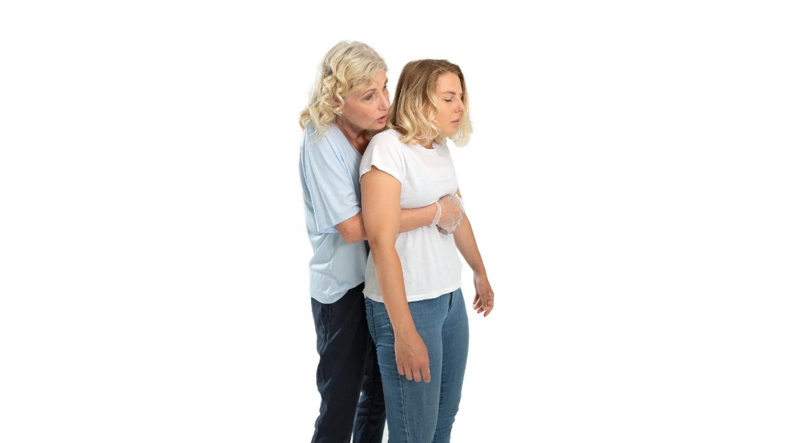 Letztes Mittel: Faust unterhalb des Brustbeins auf den Bauch legen, ruckartig nach hinten-oben ziehen.