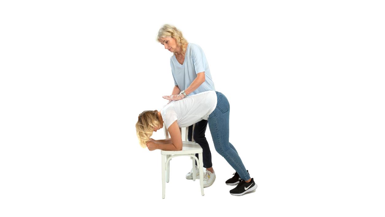 Ineffektives Husten: Oberkörper tief lagern, 5x mit Handfläche zwischen Schulterblätter klopfen, im Wechsel wiederholen.